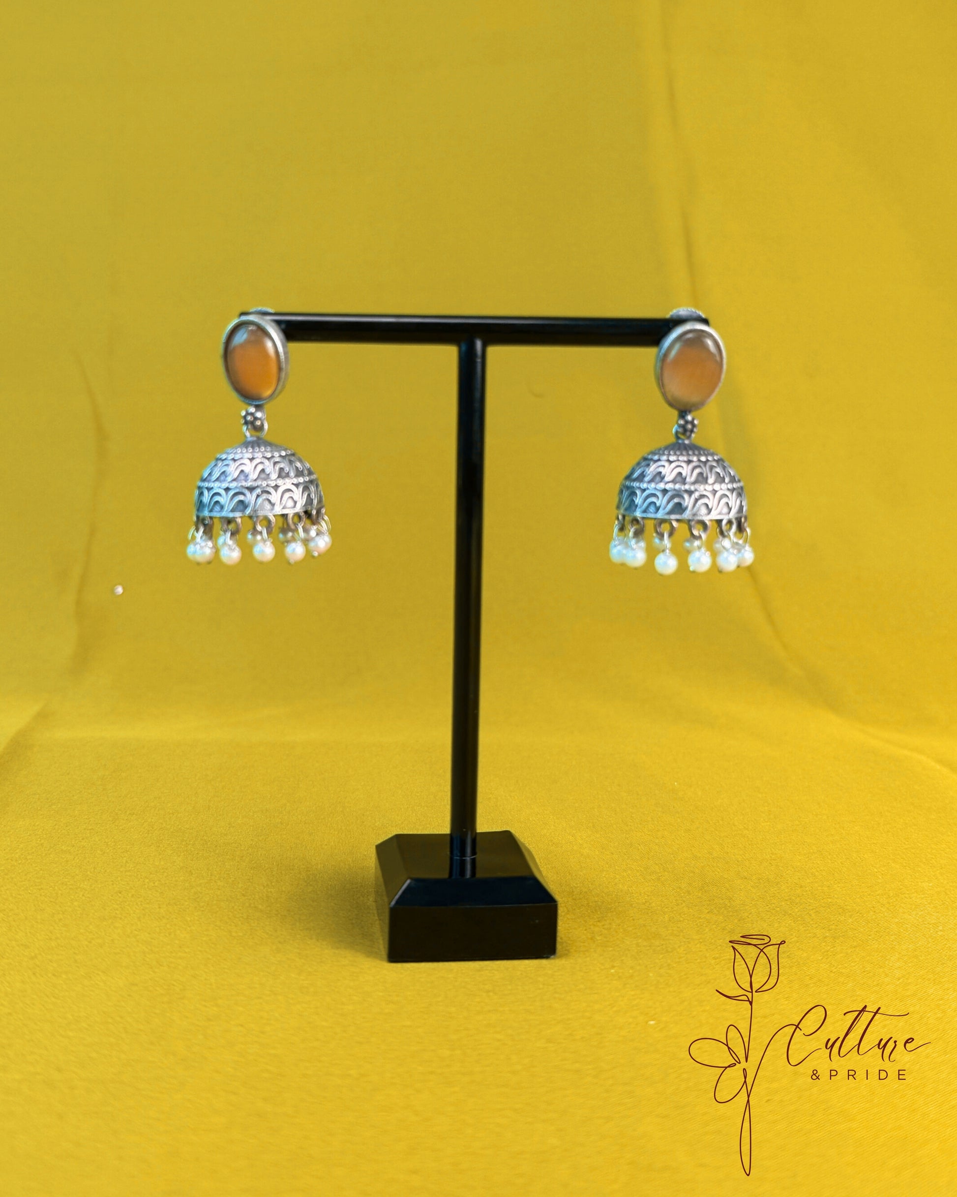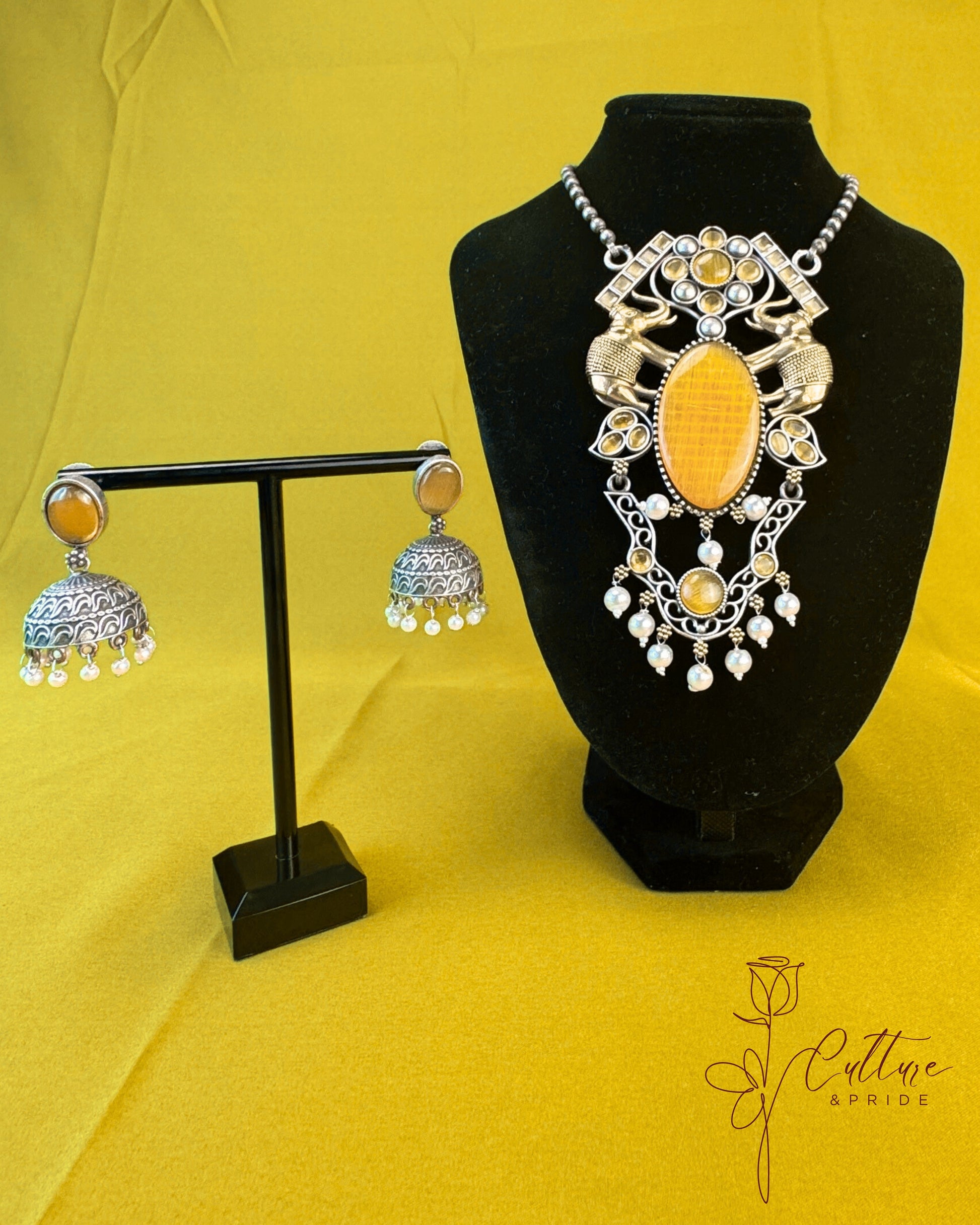 Command attention with regal charm in the Golden Aura Royal Necklace Set, a handcrafted German silver masterpiece by Culture & Pride. The majestic centerpiece features a rich mustard-golden stone surrounded by intricate tribal engravings, mirror accents, and dual peacock motifs—symbolizing grace and strength. Adorned with pearl dangles and matched with classic jhumka-style earrings, this set brings elegance to any traditional or Indo-western ensemble.