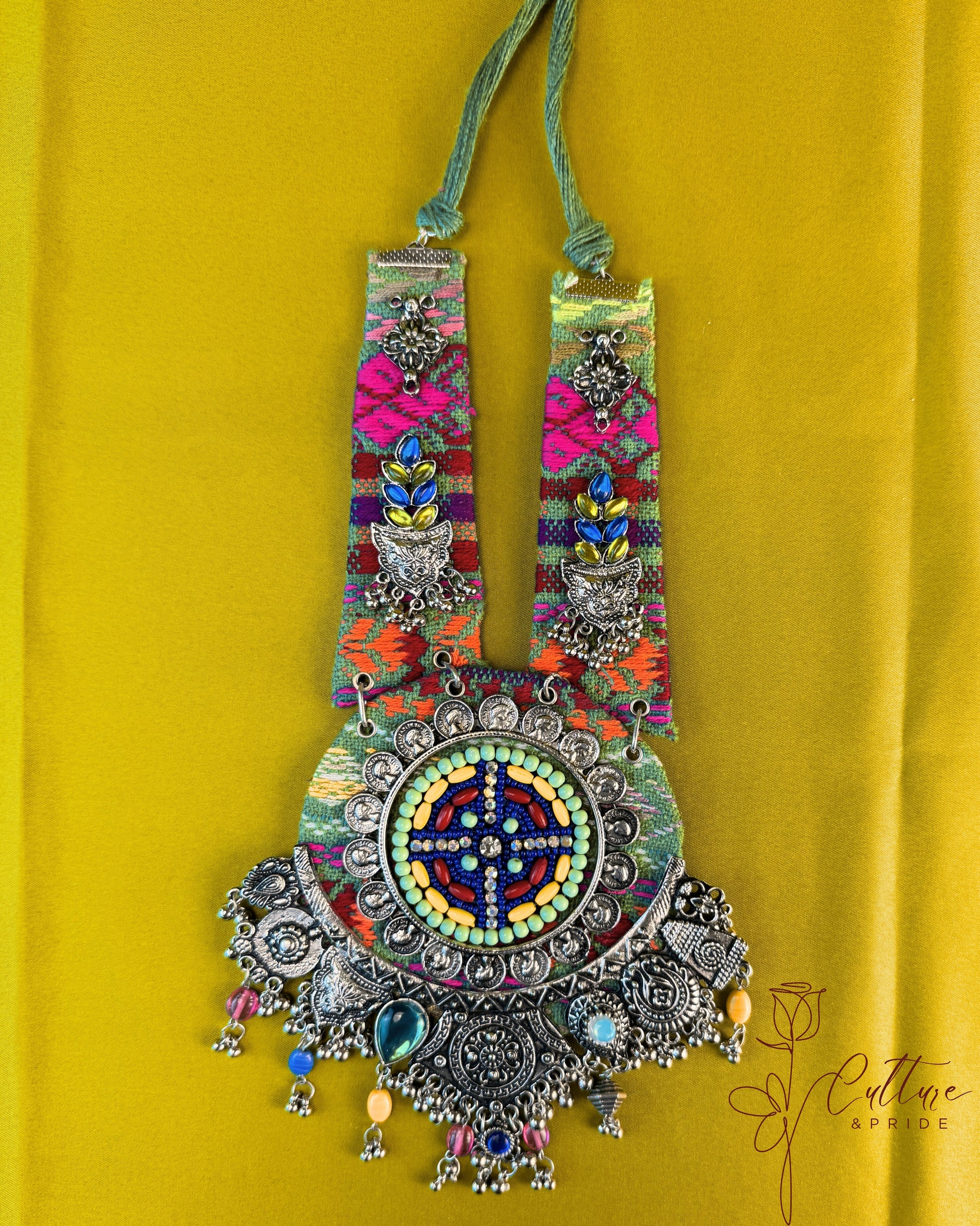 Celebrate color, courage, and culture with the Jungle Jalsa Tribal Necklace by Culture & Pride. Crafted with a vibrant multicolor woven base and rich green thread closure, this handcrafted necklace features a circular pendant highlighted by mirror work, tribal motifs, and playful bead embroidery in blue, orange, yellow, and more.