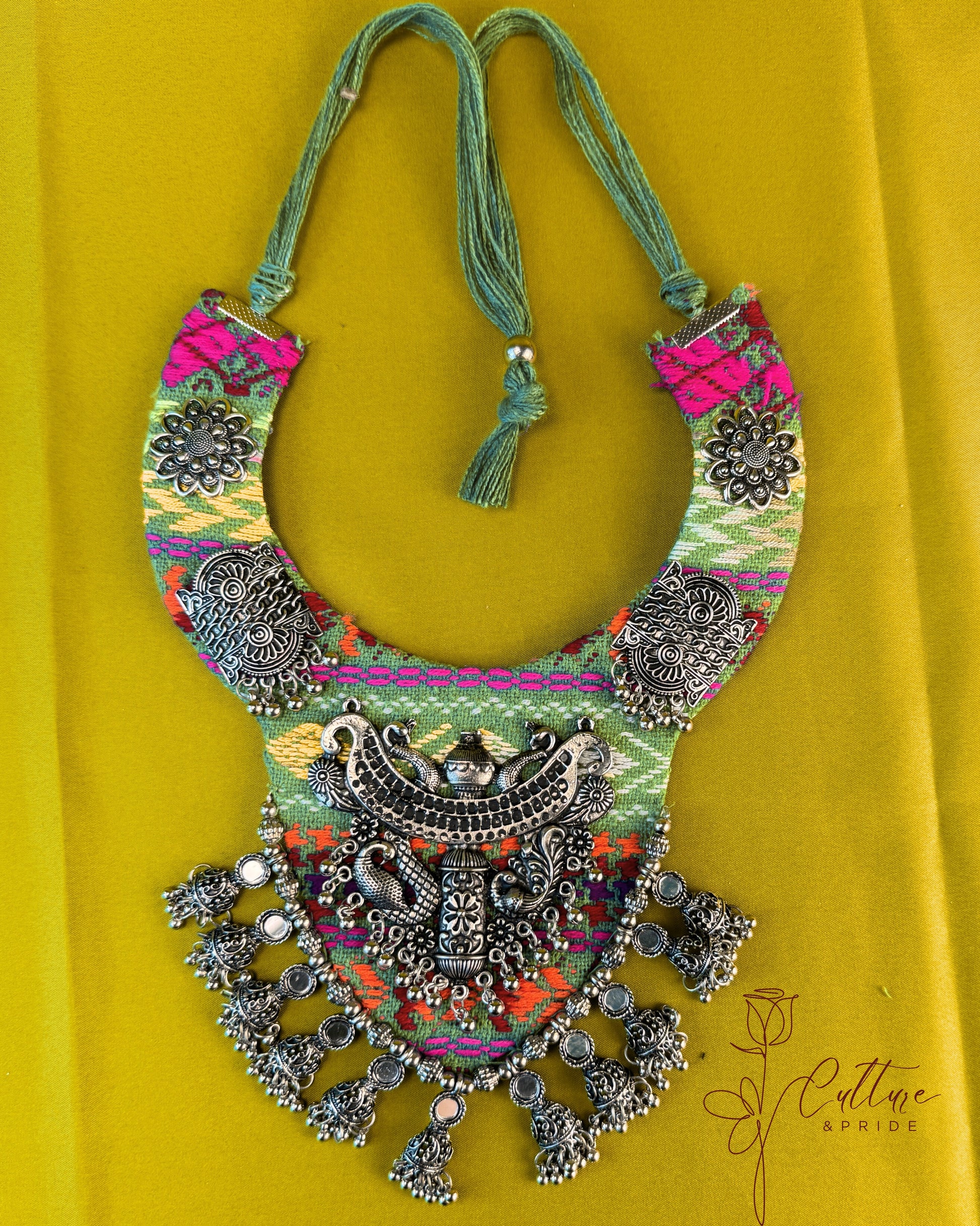 Celebrate tradition and symbolism with the Kalash Viraasat Heritage Necklace by Culture & Pride. Handcrafted on a vibrant multicolor textile base, this bold piece showcases a central oxidized kalash and twin peacock motif, signifying purity, celebration, and prosperity in Indian culture.
