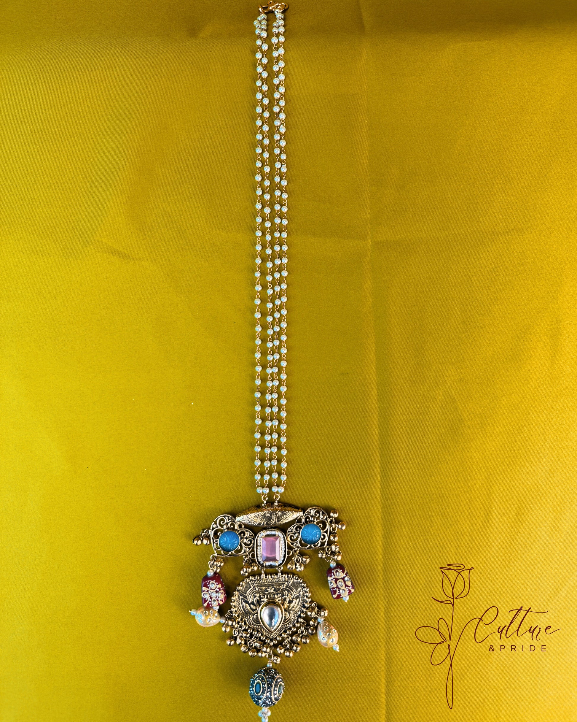 The intricate layering and bold center motifs make this necklace a perfect pick for bridesmaids, Navratri Garba nights, or anyone seeking a royal desi glow. Finished with beaded pearl strings for a secure fit and graceful fall.