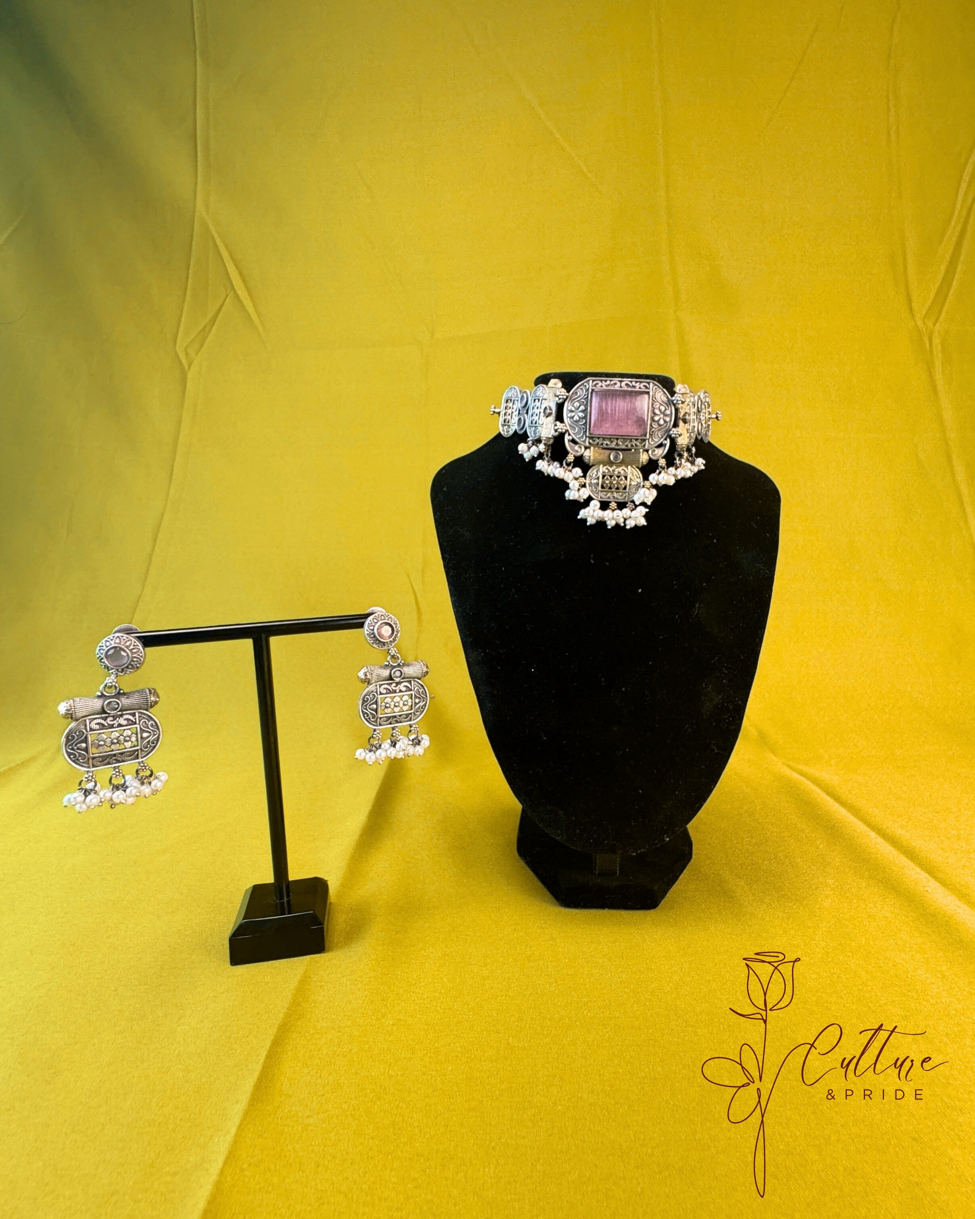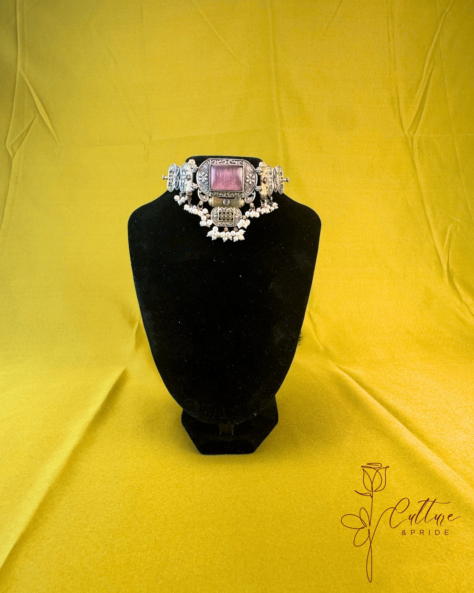 Bold. Regal. Timeless. The Rajwadi Pearl Choker Set by Culture & Pride blends ancient artistry with modern festive fashion. This handcrafted oxidized German silver choker features a bold central motif, engraved temple-style designs, and delicate white pearl drops that add elegance with every glance.