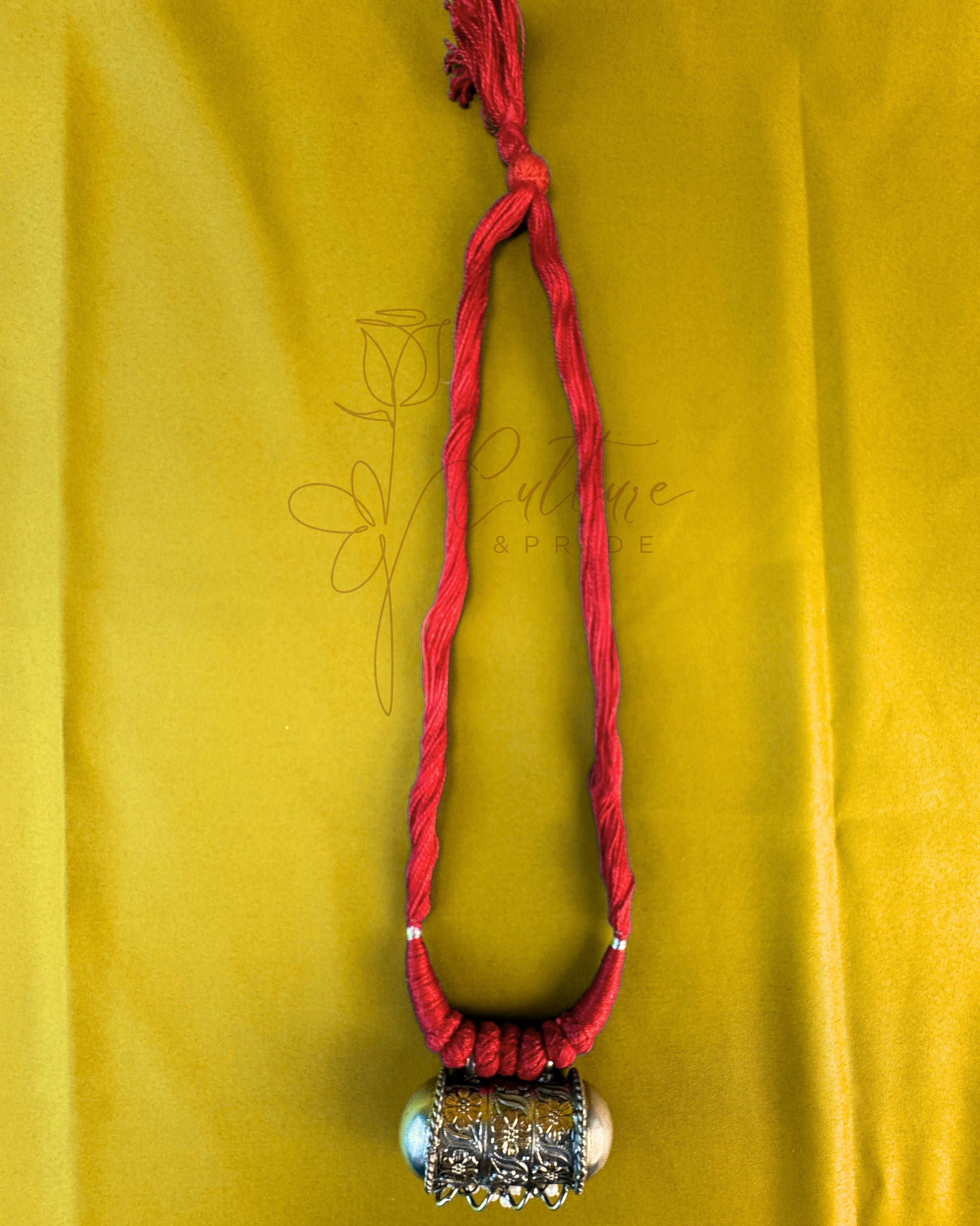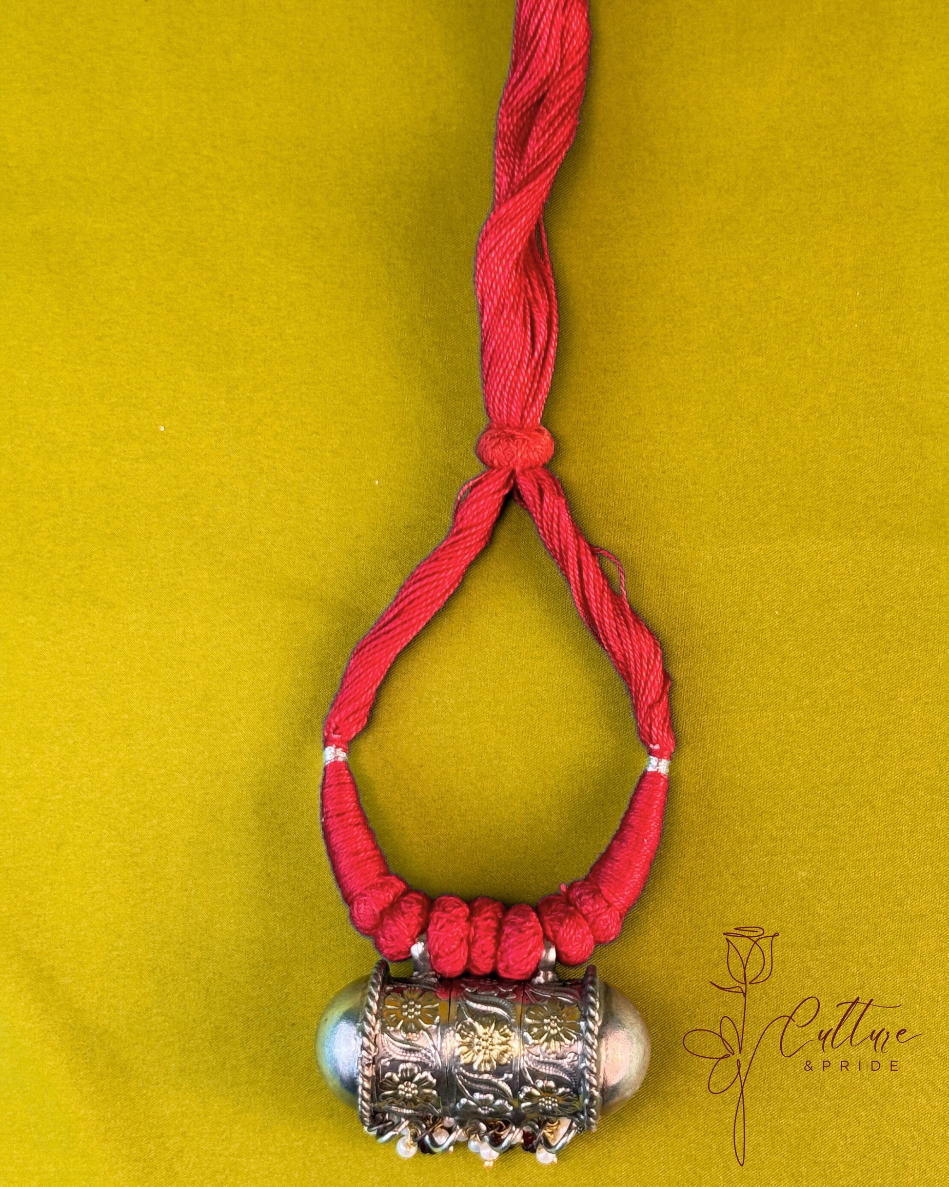 Elevate your traditional look with this handcrafted German silver tribal necklace, exclusively from Culture & Pride. Featuring a beautifully engraved cylindrical pendant with floral motifs, this piece showcases the richness of Indian craftsmanship.